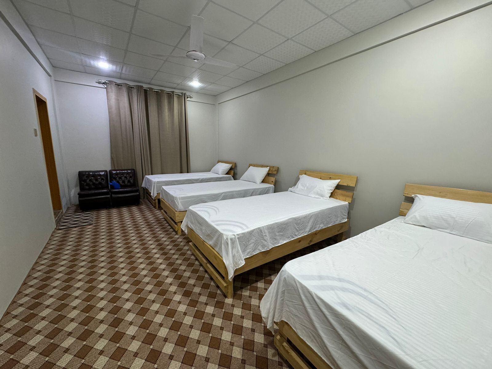 Large group room featuring 5 single beds, perfect for families or friends—2 extra mattresses available for added guests.